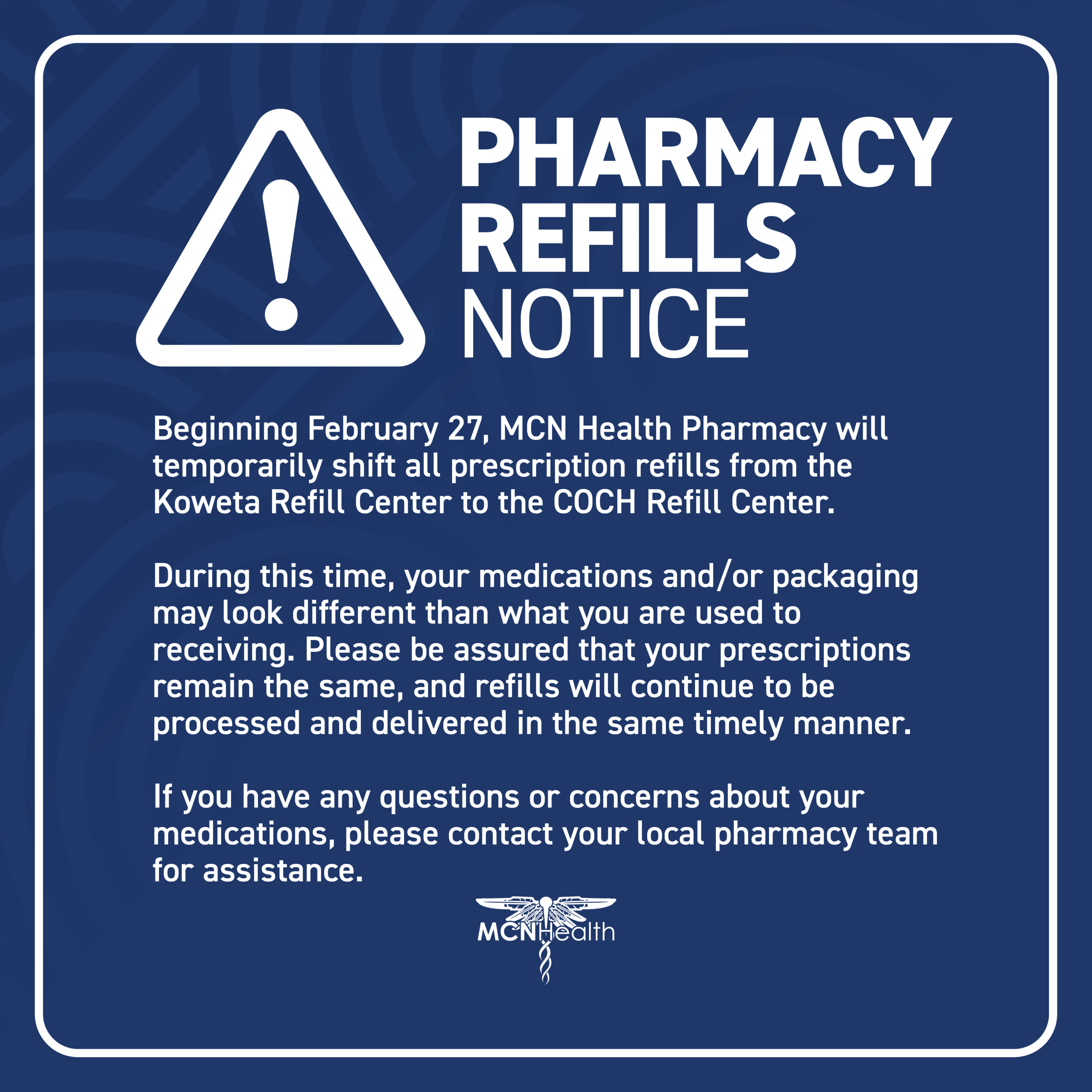 MCN Health Pharmacy is temporarily shifting all prescription refills from the Koweta Refill Center to the Council Oak Comprehensive Healthcare (COCH) Refill Center.
